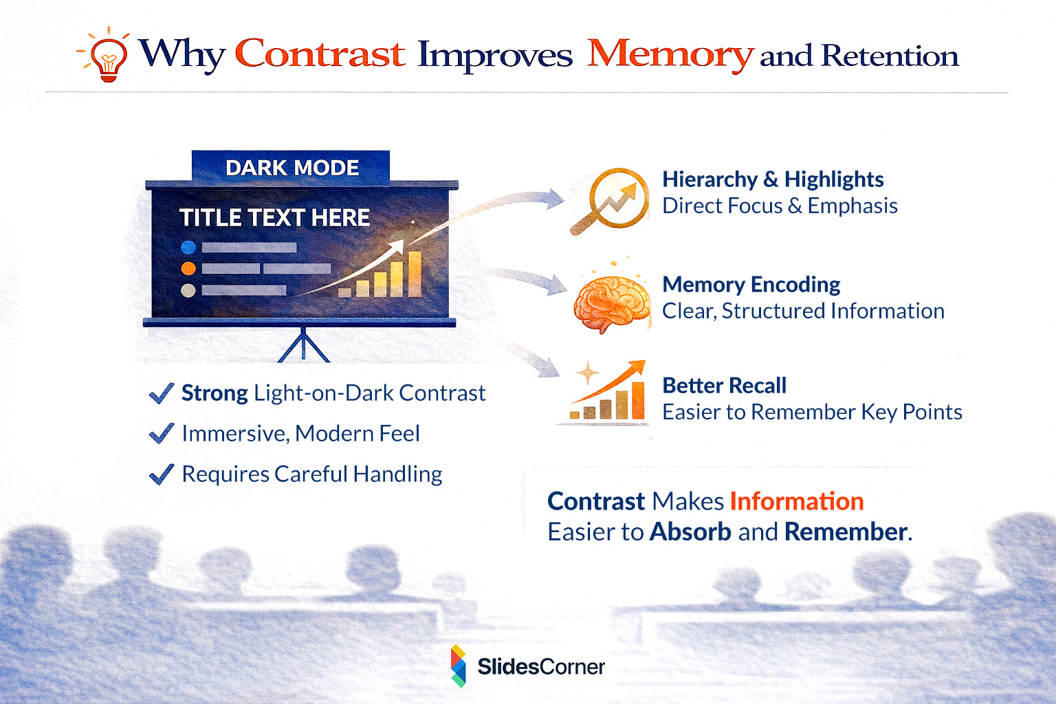 Contrast doesn’t just affect readability; it affects memory. Information presented with clear hierarchy and strong contrast is easier to encode and recall. This is especially relevant in presentations designed to persuade, teach, or sell.
