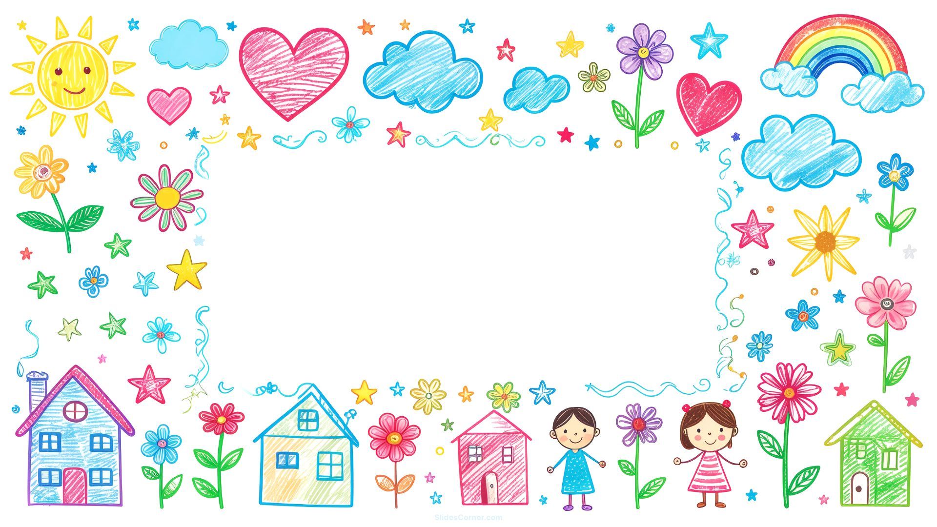 The background features playful illustrations such as stars, hearts, rainbows, clouds, a smiling sun, little houses, and happy children. All the drawings are placed around the edges, creating a natural frame while keeping the center completely clear. This open space is perfect for titles, images, charts, or educational content, making the Back to School Background both visually attractive and highly functional for PPT, Slides, and wallpaper use.