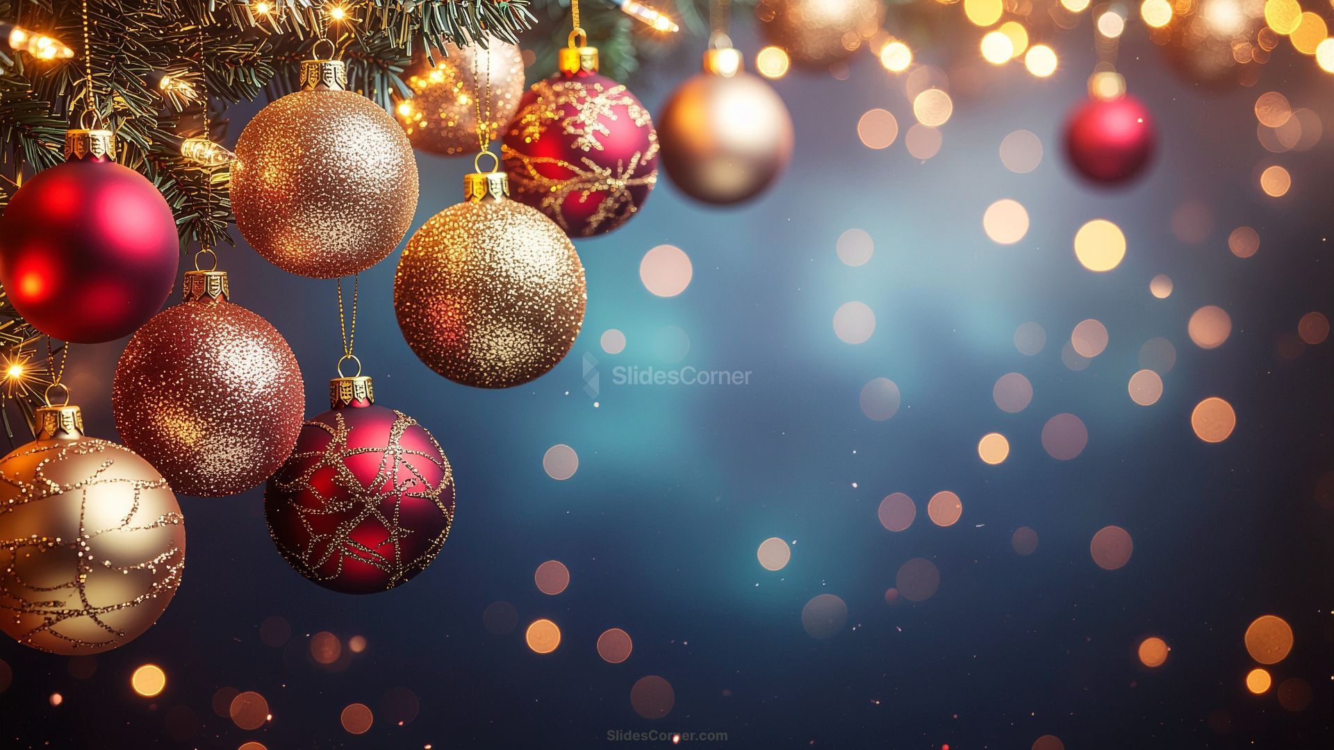 If you’re searching for a warm, festive, high-quality Christmas PowerPoint Background that instantly elevates your holiday presentations, this one is designed to hit that perfect sweet spot between classy and Christmassy. Imagine a soft, glowing field of golden bokeh lights, paired with elegant red and gold baubles gently hanging from the upper left corner. The rest of the frame stays intentionally clean and softly blurred, leaving a generous central space for titles, text, or any slide content you want to highlight.