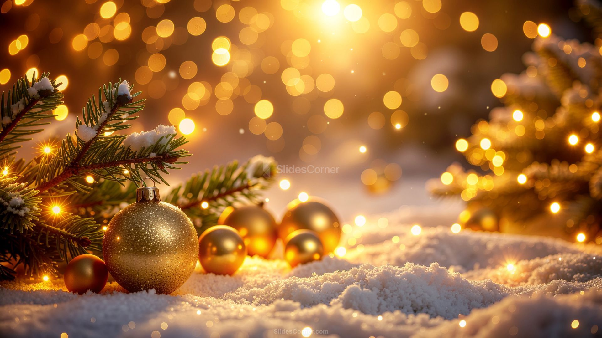 A free HD Christmas Background with snow, golden lights and ornaments, perfect for elegant holiday slides and wallpapers.