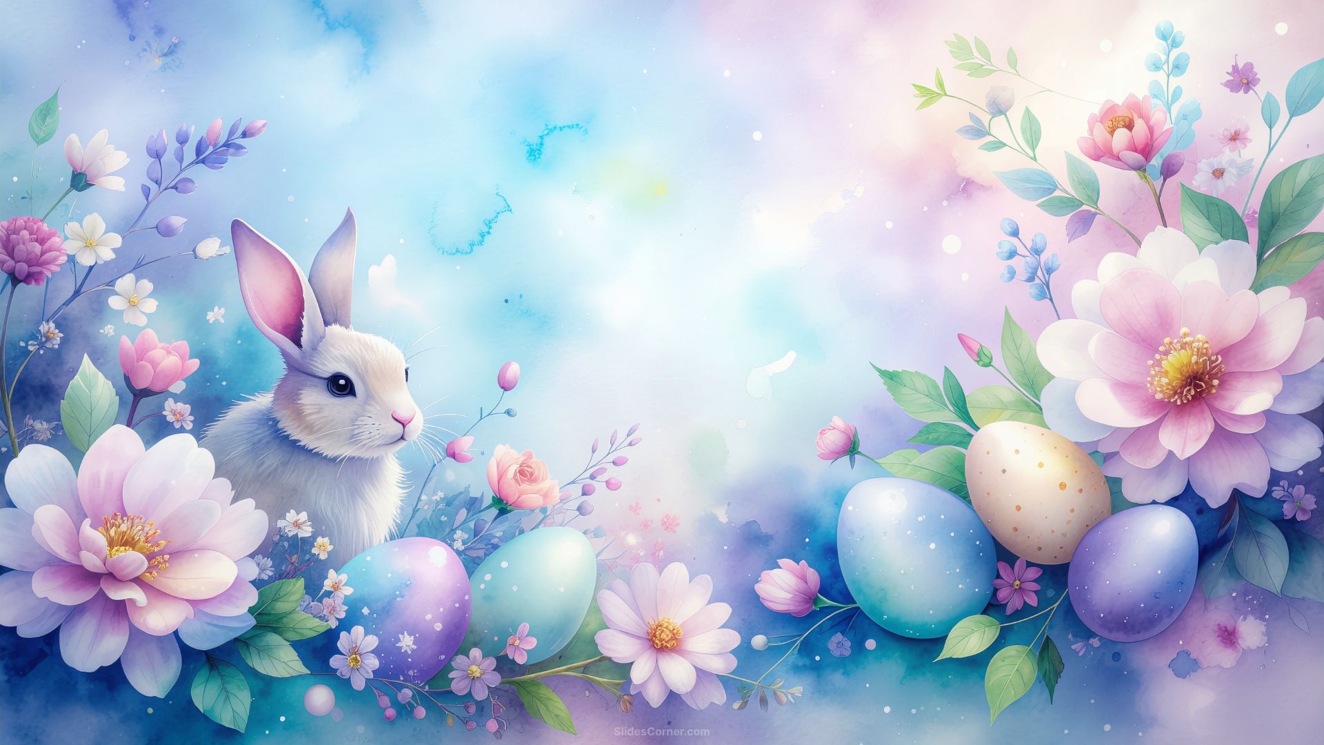 Download this free Easter background in HD and create charming slides with a bunny, flowers, and Easter eggs.