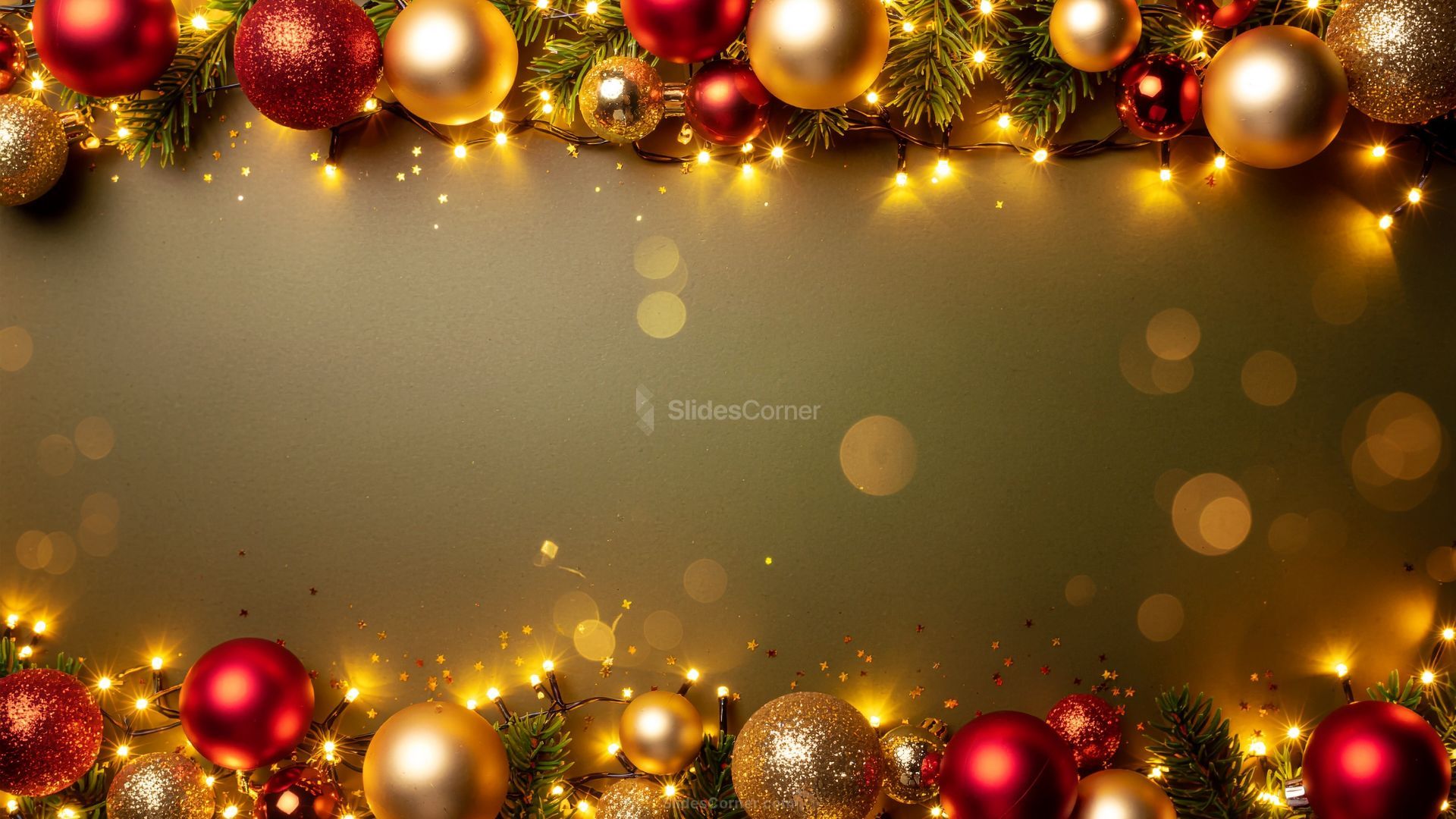If you’re looking for a refined and festive Christmas Background that instantly elevates your presentation, this free HD design is a perfect choice. Built around a clean golden canvas, it features a decorative border made of glowing lights, red and gold baubles, and intertwined Christmas tree branches. The result is a warm, elegant, and unmistakably Christmassy background that works beautifully for professional slides, holiday announcements, or seasonal wallpapers.