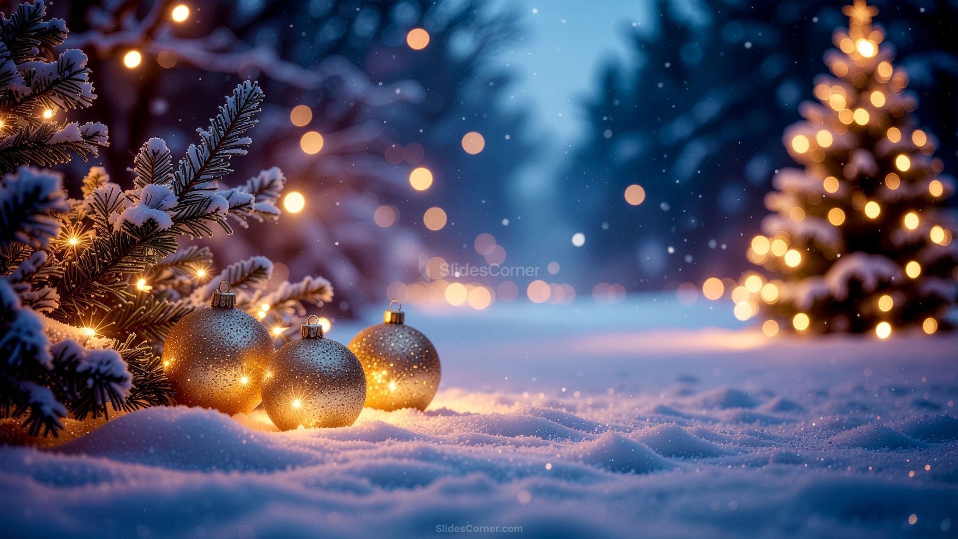 This background by SlidesCorner.com features a snowy landscape with delicate tree branches in the foreground, gently illuminated by golden Christmas lights. Decorative golden ornaments rest on the snow, enhanced by a subtle bokeh effect and shallow depth of field. On the right side of the image, a softly blurred Christmas tree glows in the background, adding depth, warmth, and a truly Christmassy atmosphere.